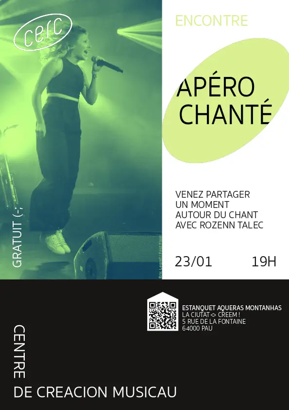 A l’occasion de sa venue en résidence à CERC, Rozenn Talec, artiste issue de la tradition des chanteuses et chanteurs de kan-ha-diskan, le chant alterné à danser en langue bretonne, vous propose un apéro chanté ouvert à tou.te.s à 19h, à l’estanquet de La Ciutat.