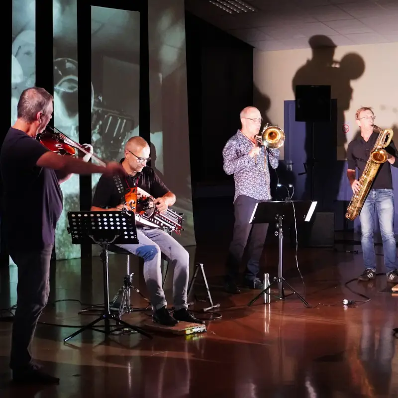 Un roumain, un breton, un brun, un blond, des fils de crin, un baryton. Leur musique très faiblement carbonée, entre écritures et improvisations, voyage d’est en ouest en passant par le sud et d’ouest en est en passant par le nord. À écouter et à danser, le répertoire est unique, inclassable, inétiquetable et inarchivable.