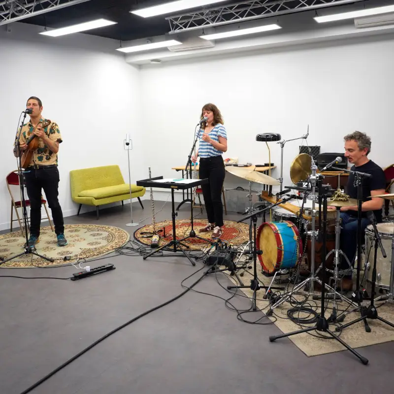 Baltazar Montanaro, Elsa Lambey et Adrien Chennebault en résidence à CERC pour leur projet Exils. Sélection de poèmes contemporains et de collec­tages de morceaux traditionnels ayant pour théma­tique commune la notion de déplacement des populations et les problématiques passées ou contemporaines qu’elles ont pu vivre.