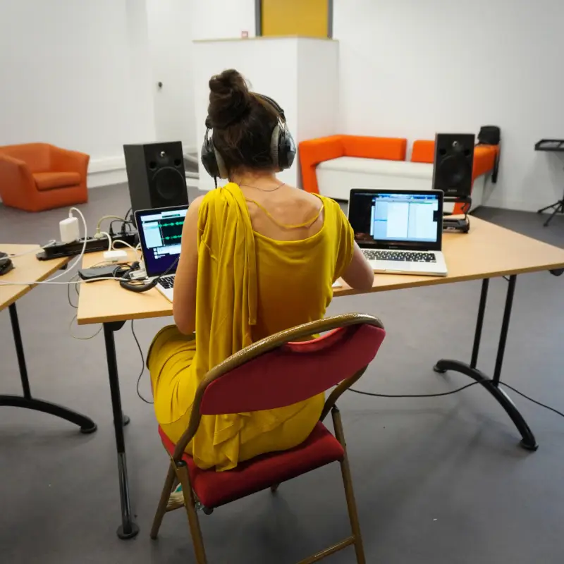 Inspirée des reflets argentés de l’océan Atlantique, tout en chantant enregistreur à la main… c’est ainsi que Julia Hanadi Al Abed devient adepte de l’écriture acousmatique et s’attache à l’enregistrement de terrain. Ses créations mêlent les modes de jeux possibles par le biais de technologies lo-fi ou hi-tech. Jeux de rétro-actions sonores et autres dispositifs électriques tracent le sillon de l’écoute, déclinant différentes facettes d’une pratique musicale électronique.