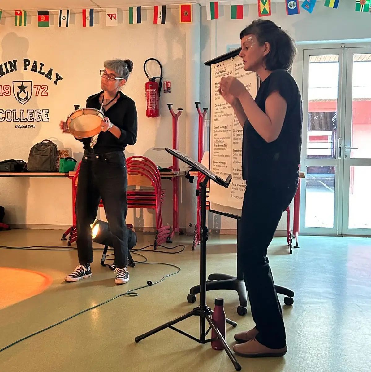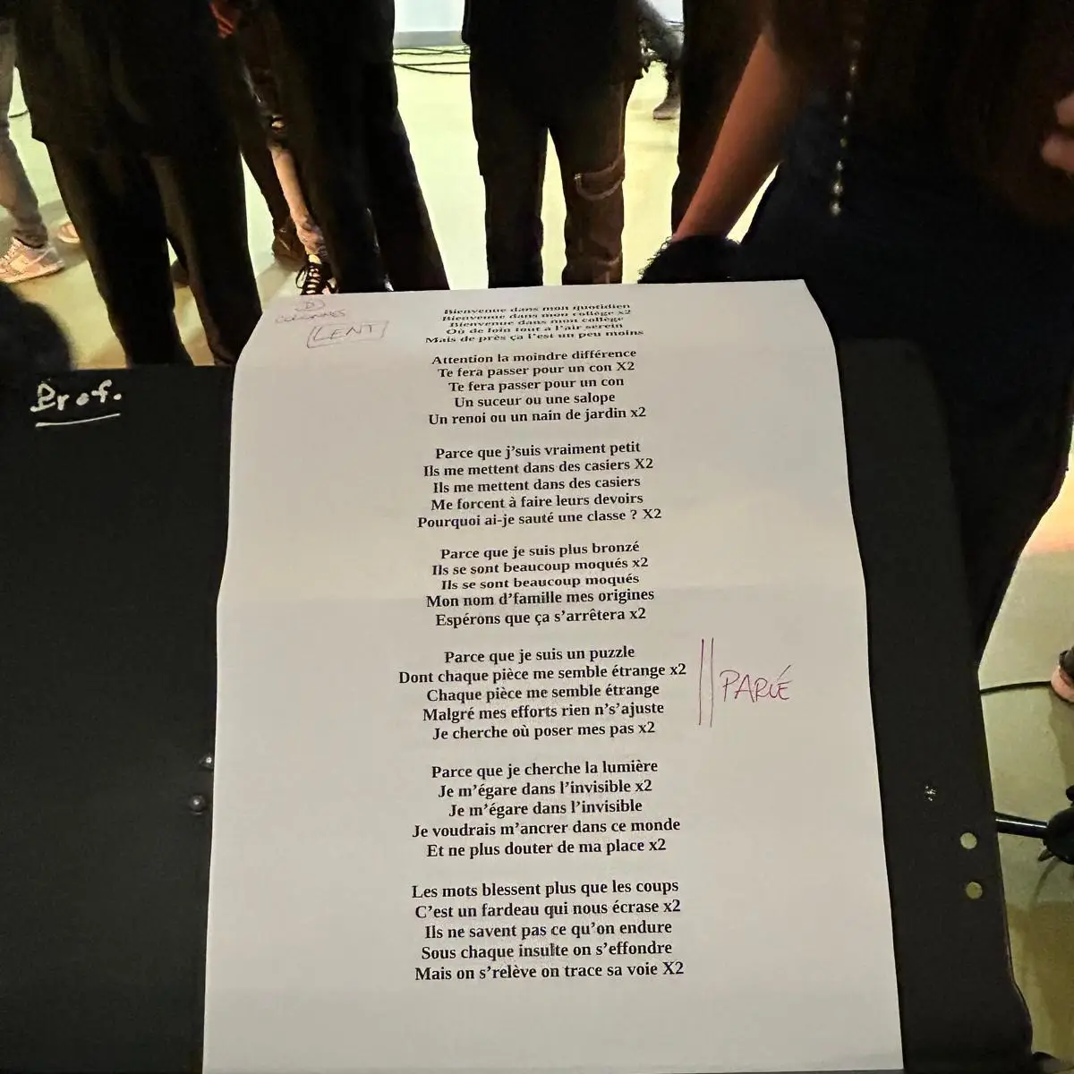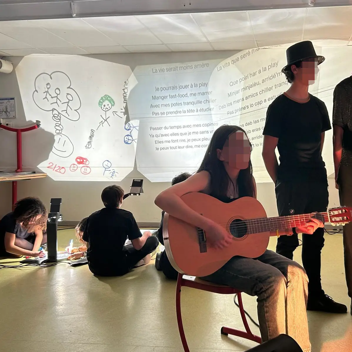 Les élèves de la classe de 3°A du Collège de Simin Palay se sont donc embarqués dans cette aventure de création avec au début plus ou moins de réticence. Après avoir été amenés à découvrir le groupe Aèdes, duo de Thomas Baudoin et Lutxi Atchary, chanteuse et porteuse du projet, lors d’un filage à la Ferronnerie, ils ont ensuite démarré les ateliers accompagnés de l’équipe du projet : Lutxi Achiary, chanteuse et intervenante, Mylène Charrier qui les a aidé à réfléchir, à libérer la parole, à verbaliser et à écrire les idées émergentes,Thierry Moinet qui les a guidé sur le chemin de la création à travers la scénographie finale du spectacle et Marilyne Argueil leur professeur d’éducation musicale.